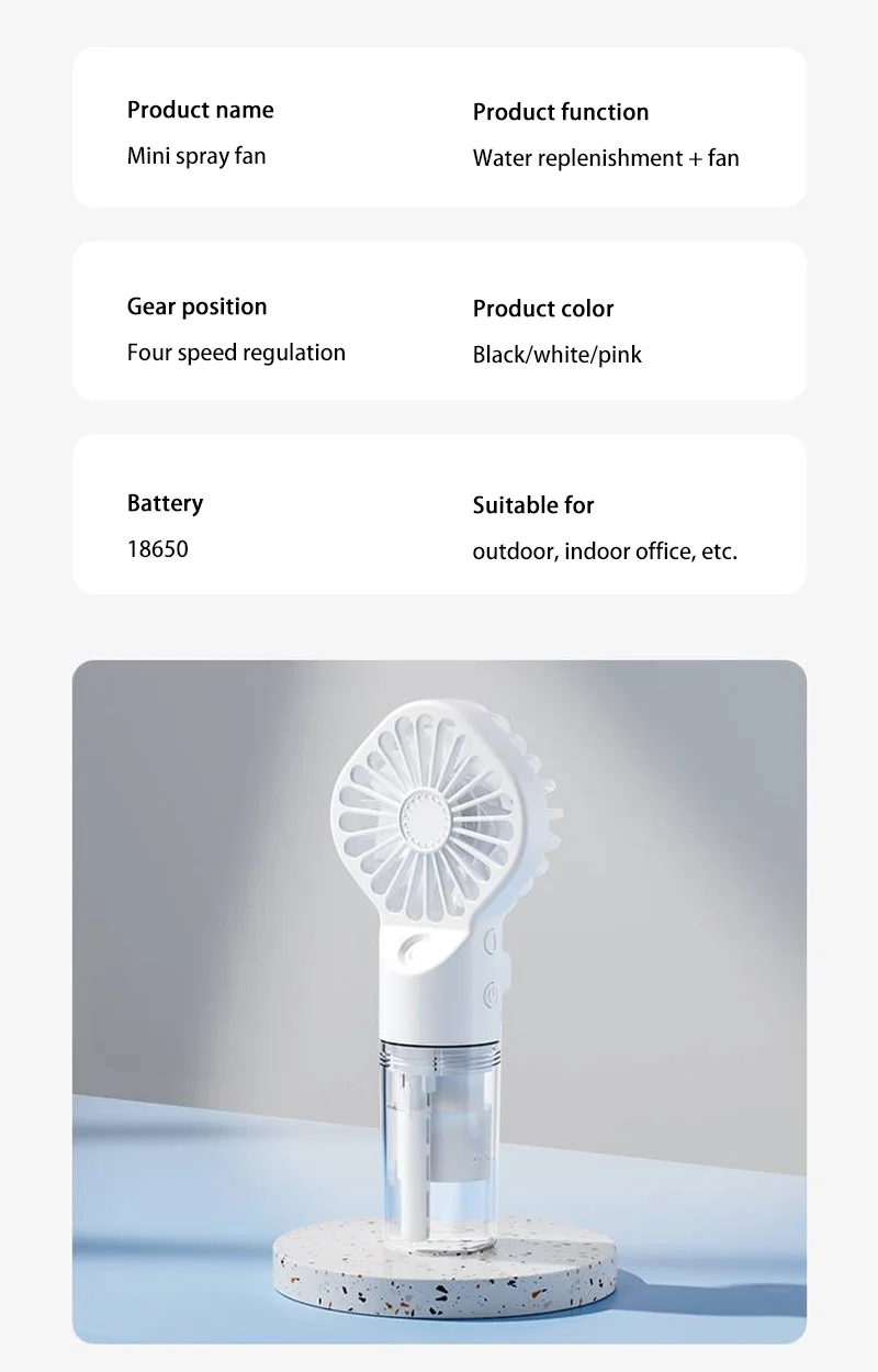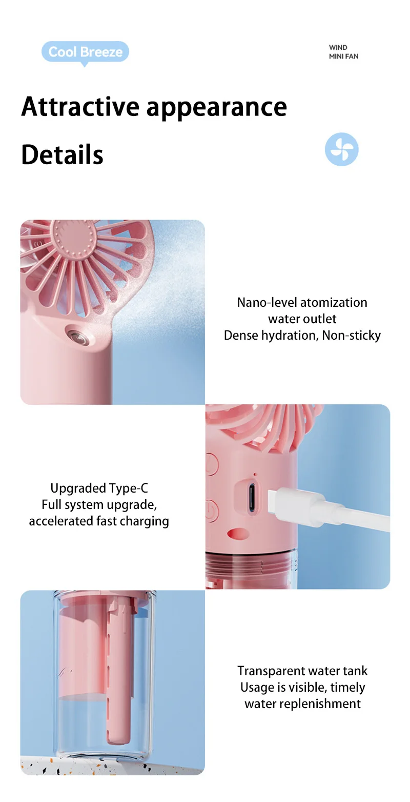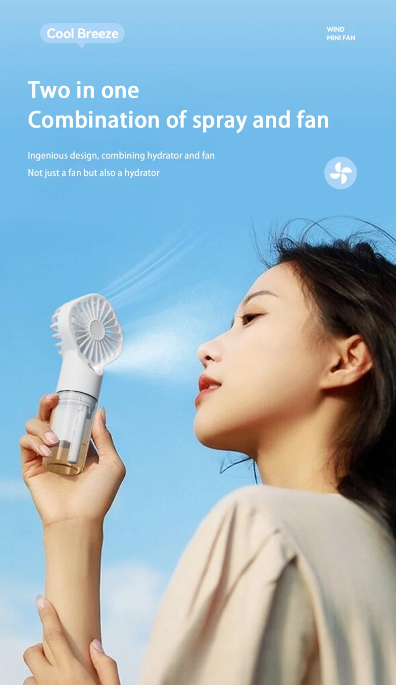 1.This handheld mist fan perfectly combines the two functions of mist and fan. Whether it is a hot summer day or a dry environment, it can bring you cool breeze and moist water mist, allowing you to enjoy an all-round comfortable experience. .